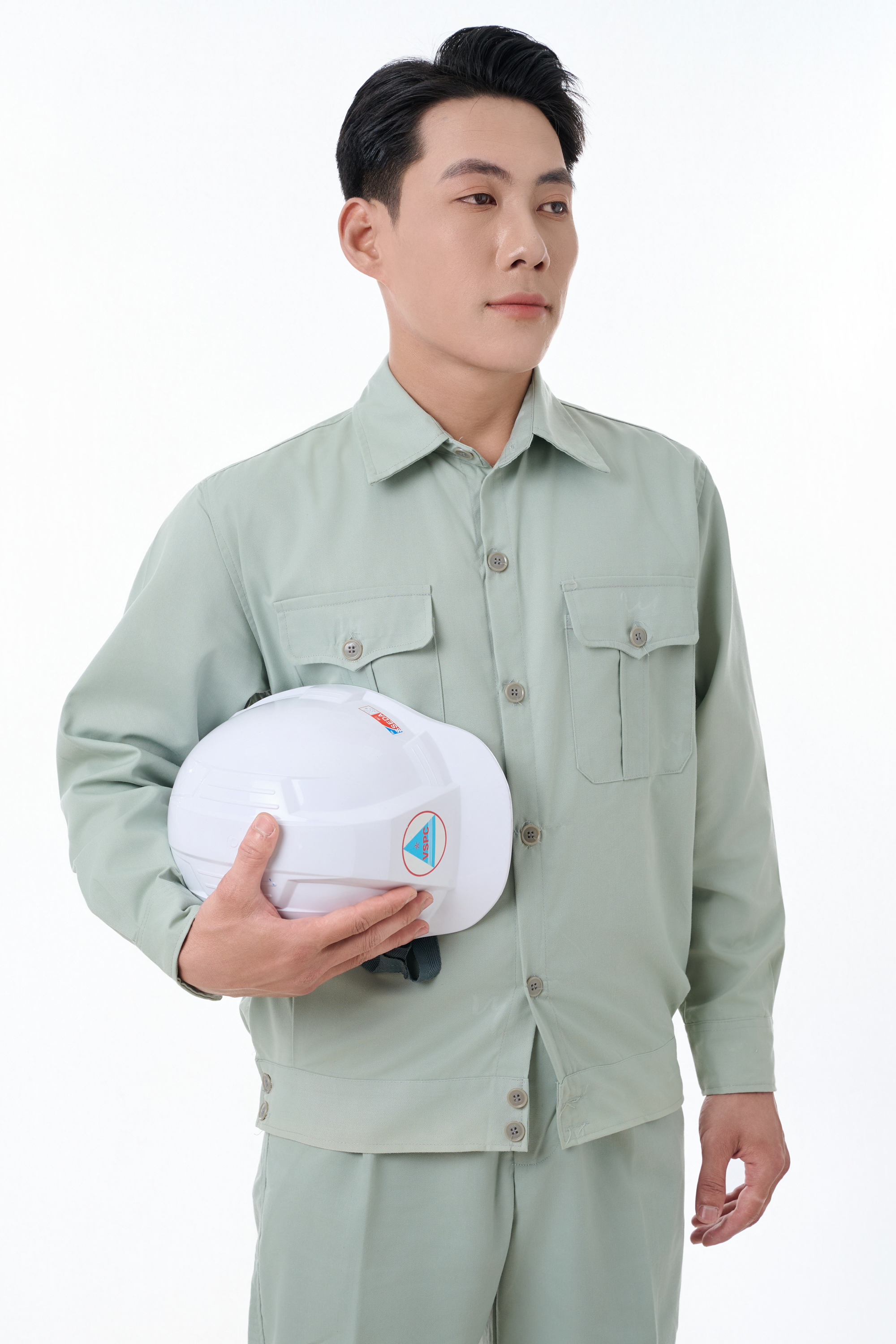 Đối với bộ đồ bảo hộ màu ghi sáng này nhà thiết kế không quá phức tạp. Các chi tiết sử dụng trên bộ quần áo nhìn vào thể hiện được trình độ chuyên môn, tính tự chủ cao. Đối với người nhìn vào sẽ cảm thấy dễ chịu và thoải mái từ người mặc tới bộ đồ.